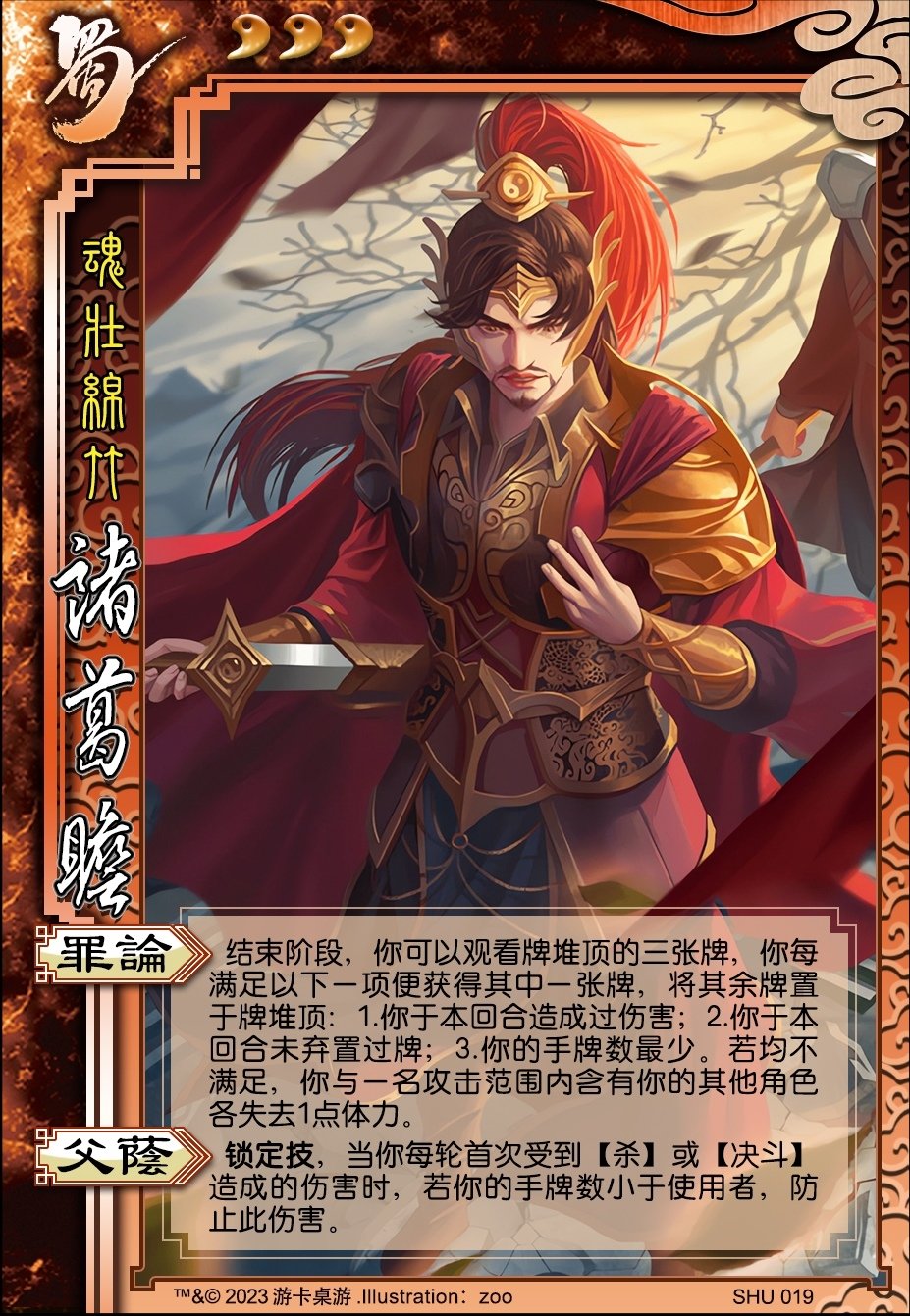 蜀汉丞相诸葛亮长子,袭爵武乡侯,官至行都护、卫将军,平尚书事,与董厥共掌朝政;擅长书画、记忆力强