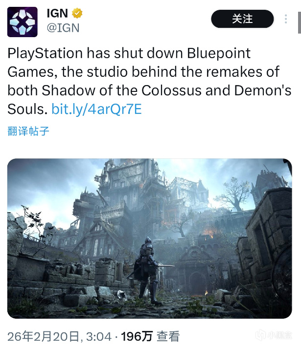 2026年2月20日,IGN发文称:PS已关闭曾负责《旺达与巨像》和《恶魔之魂》重制版的【蓝点游戏】工作室。