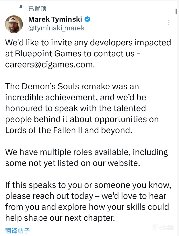 当日,《堕落之主2》开发商CI Game的创始人【Marek Tyminski】向被关闭的【蓝点游戏】工作室的开发者伸出橄榄枝,并将该推文置顶。