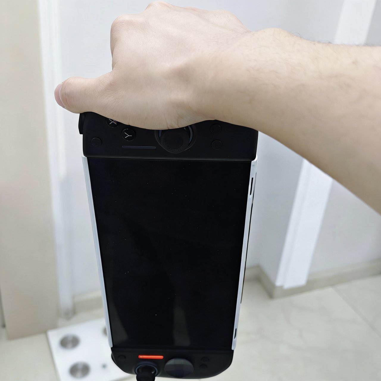 掌机模式下,相比原装多了个基于人体工学设计的握把,拿在手上确实就是比原装的掌机体验好的多。但重量也实打实上来了,还好也没有重太多,结合有握把、更好发力的优点,整体使用下来还是比原装的“大平板”舒服的。