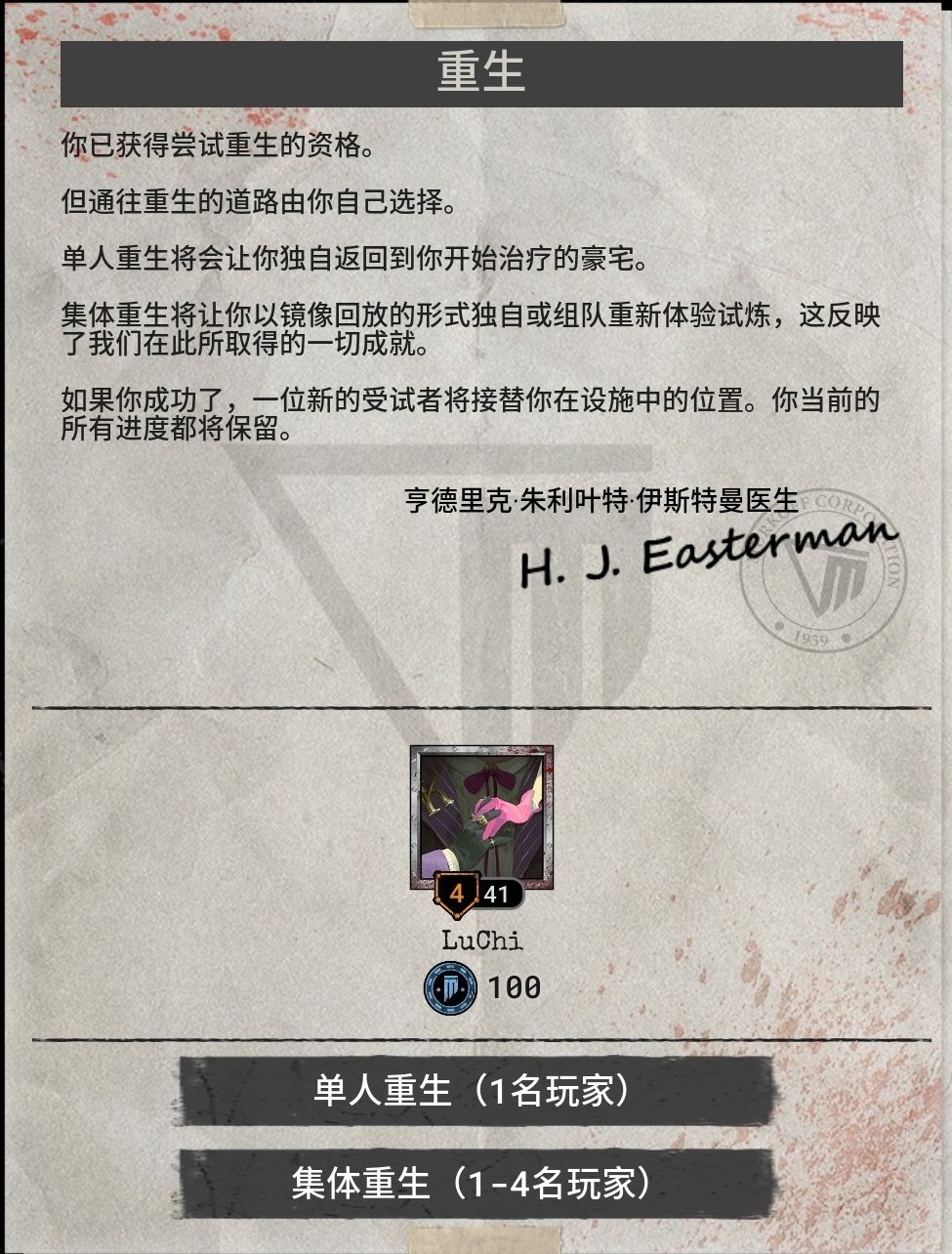 集体重生:可单人也可多人。参与随机的试炼,完成正常试炼的任务,外加收集个人档案和调频即可