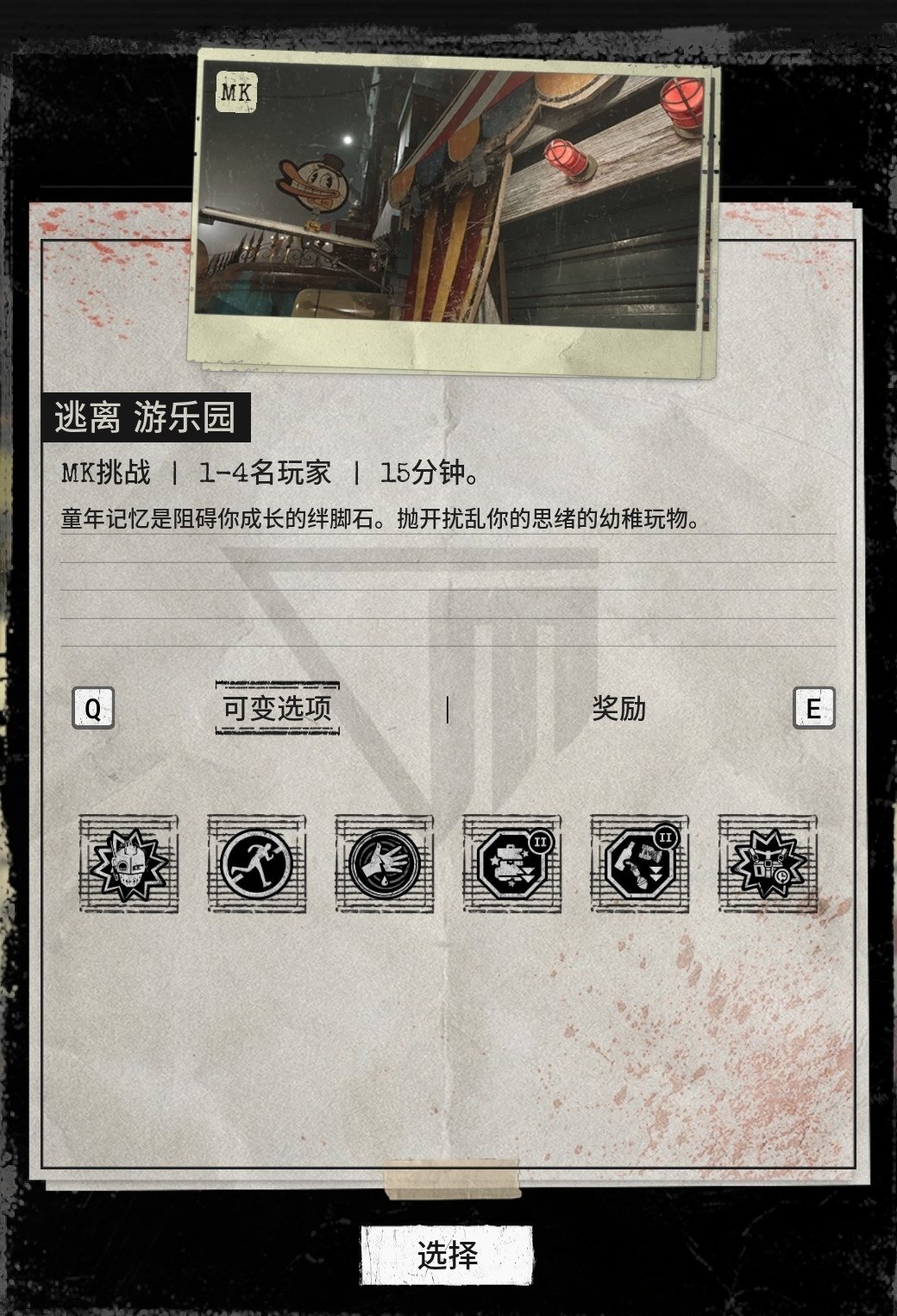 左侧警察局海报下方则是变量,初级难度有一个减少受到伤害的变量(BUFF),标准难度没有变量,困难和噩梦难度增加难度变量(DEBUFF)