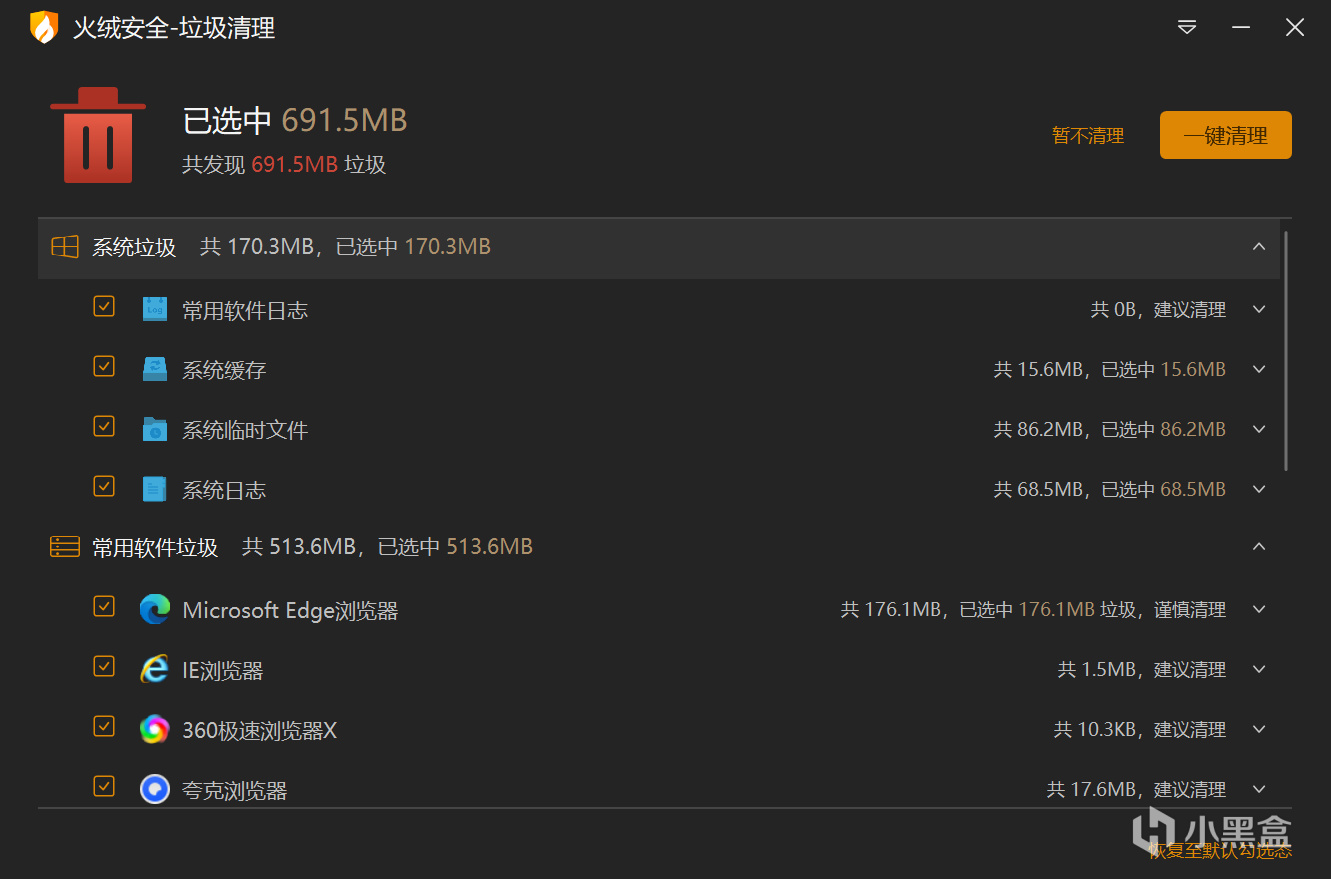 扫描完成后选择你要清理的垃圾然后点击一键清理(我个人认为上面的内容全勾选没问题,并且我也一直都是这么做的)