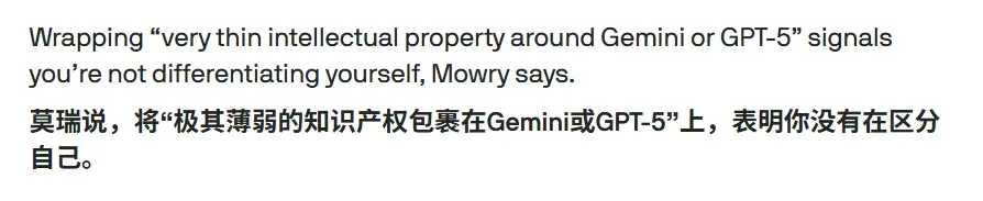 Mowry 的原话大意是,行业对这种“薄薄一层知识产权”的模式已经没耐心了,你围着各种大模型做点包装,在外观上看起来似乎确实是个产品,但底层能力却完全依赖别人。