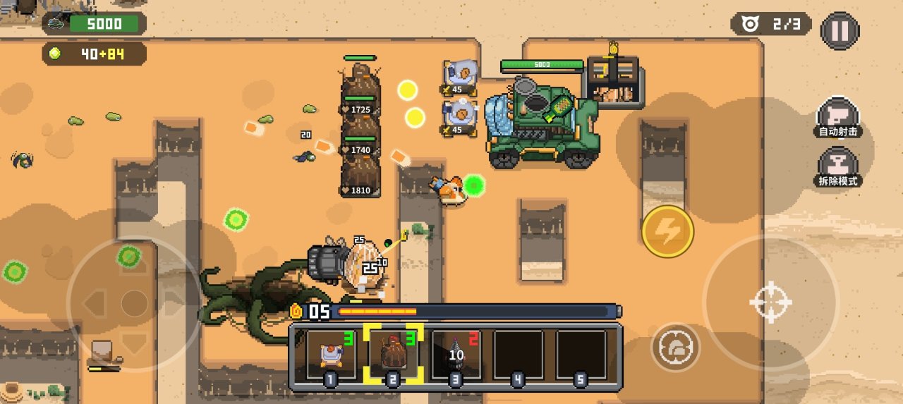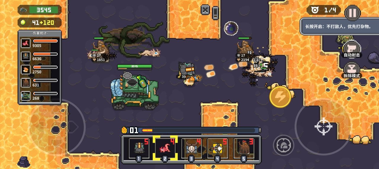 而界面中的黄色光标是大招,右侧的按钮分别是自动射击和拆除模式。射击摇杆左下方的按钮可以开启清理杂物的自动射击模式。