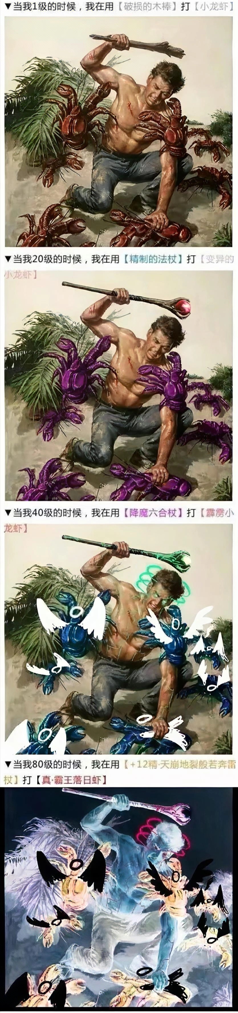 大家可能或多或少的都看过这一章表情包,一级的时候拿木棍打小龙虾,五十级的时候拿法杖打大龙虾,一百级的时候拿超级魔杖打超级龙虾