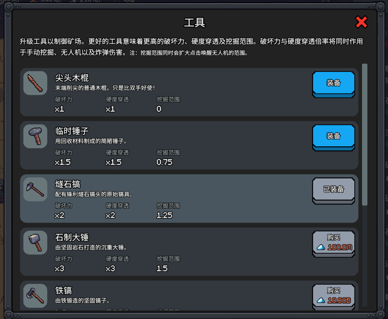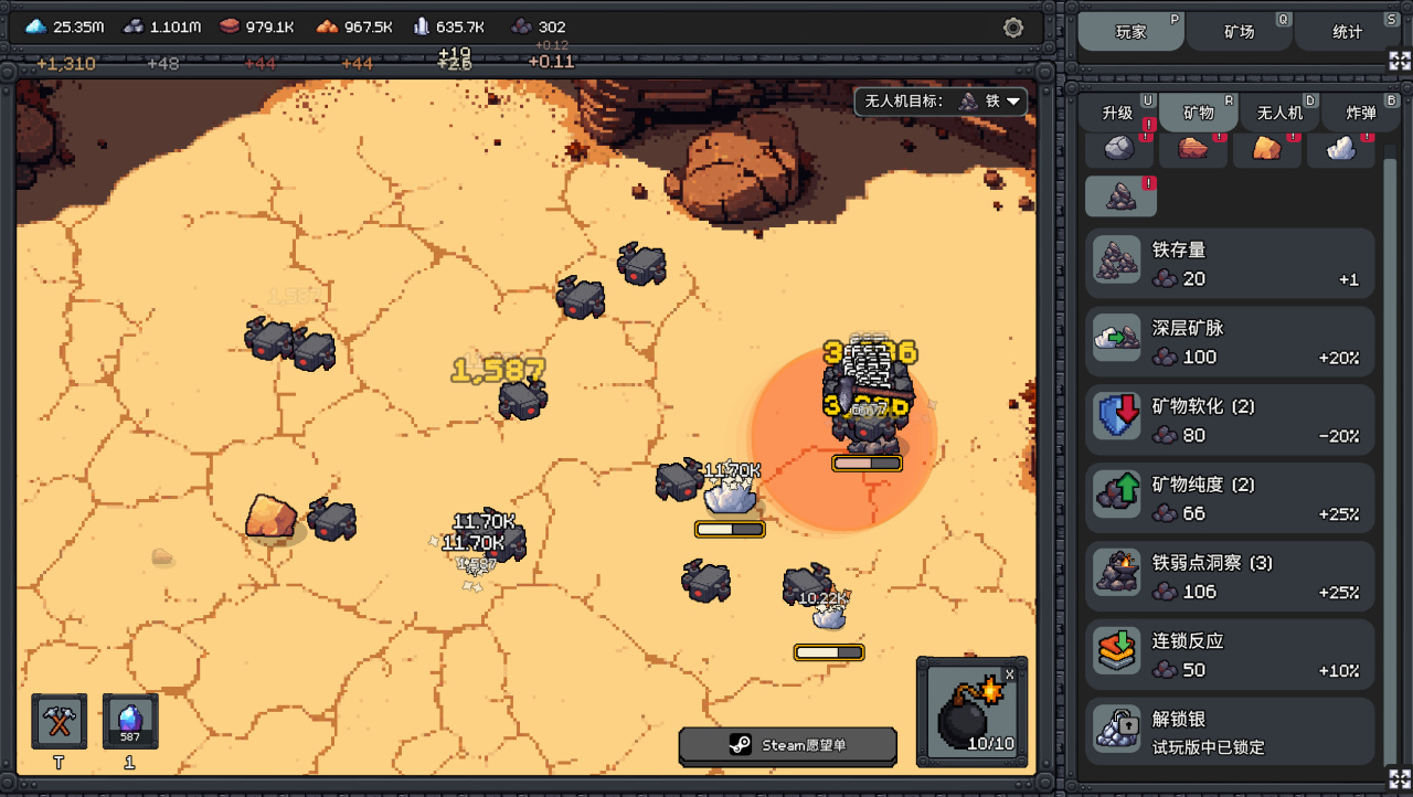 游戏目前是试玩版,我个人打到铁矿石的时候再往后就没有新的内容,比如银矿石目前显示的就是被锁了,那咱们就拿现在的内容来看看。