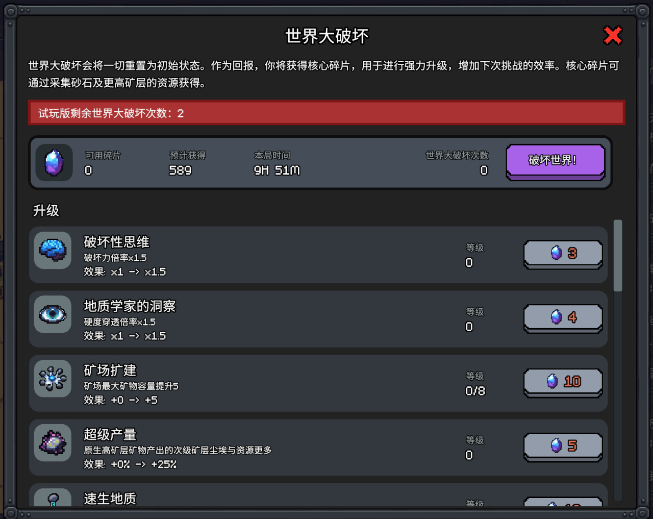 世界破坏也算是一个快速重置玩家进度和增加效率的玩法,根据现阶段的发展情况进行结算碎片来完成格外的加成,当然需要注意的是试玩版只能够重置两次为了方便截图我就先没有重置了,各项提升单从平面数据来看提升很大。