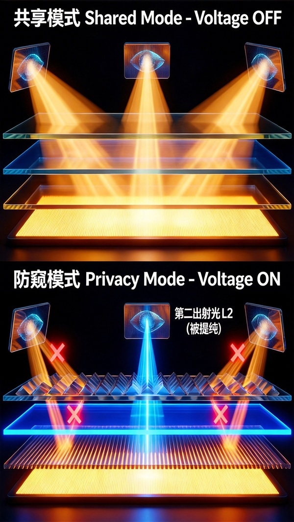 与传统的防窥膜完全不同,硬件级防窥屏是从显示底层来解决隐私问题。当用户开启防窥模式后,屏幕的折射率会发生改变。此时,第一折射层表面雕刻的微观光栅会瞬间化身为一道道微观的百叶窗,强行改变那些大角度向外折射的光线。