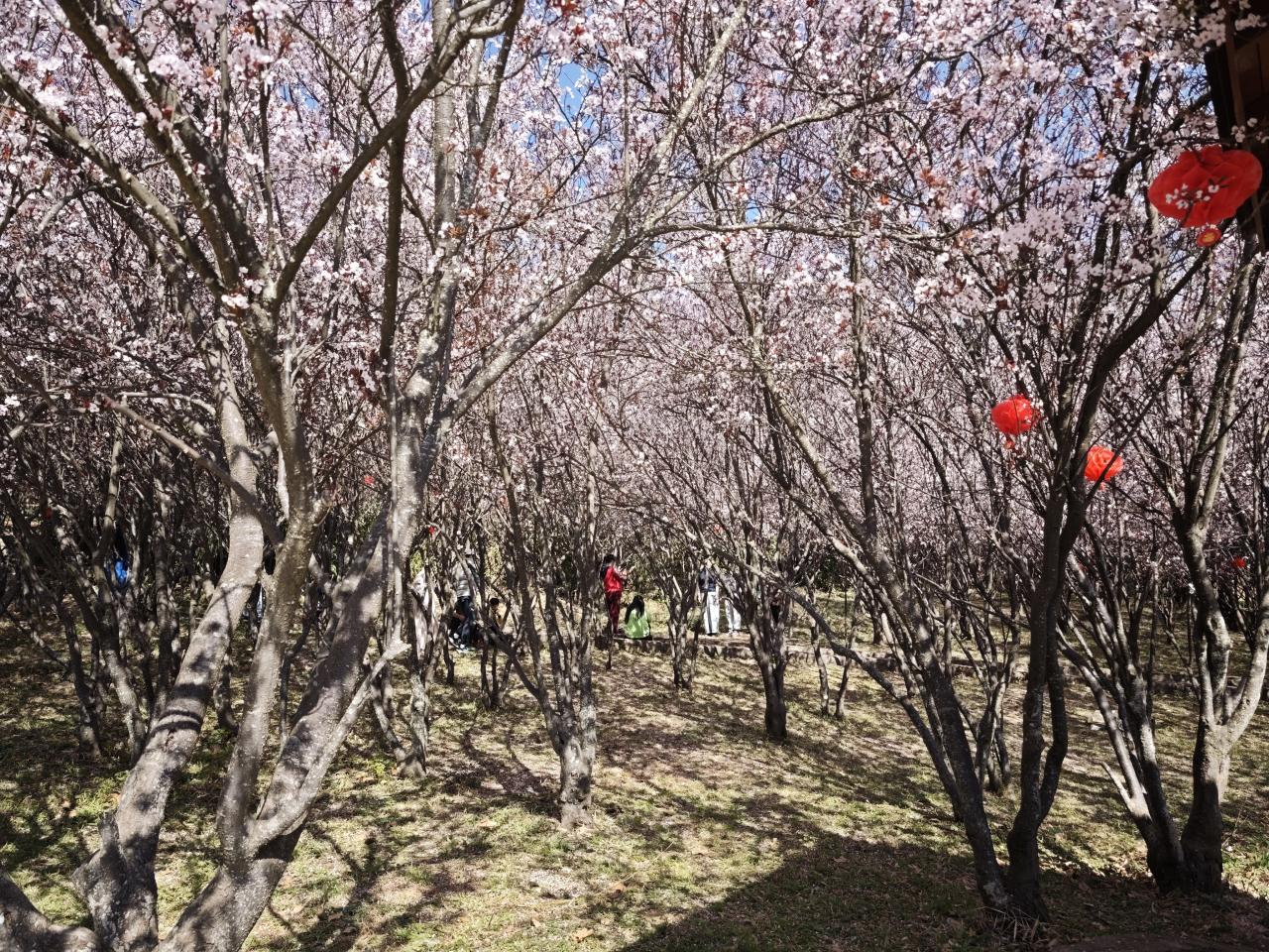 透過爛漫的花林和斑駁的日影,看得到不少夕陽紅阿姨,在裏面休憩和拍照,她們臉上洋溢的笑容和明媚的陽光一樣燦爛。