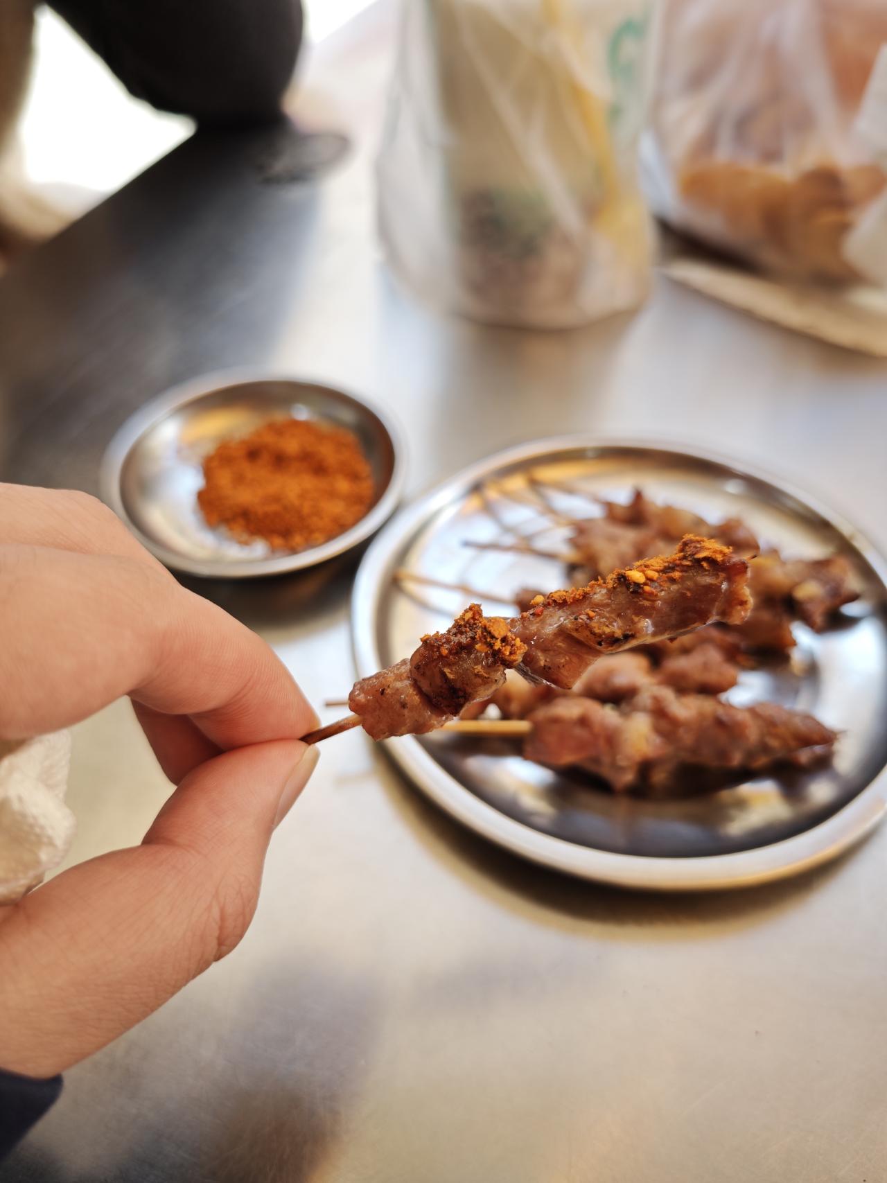 好不容易找到空位坐下,直奔主題——糖粉小肉串兒。新鮮現烤的甜口肉串兒,蘸點辣椒再入口,讓我不禁感嘆:“甜辣味兒還是太權威了”