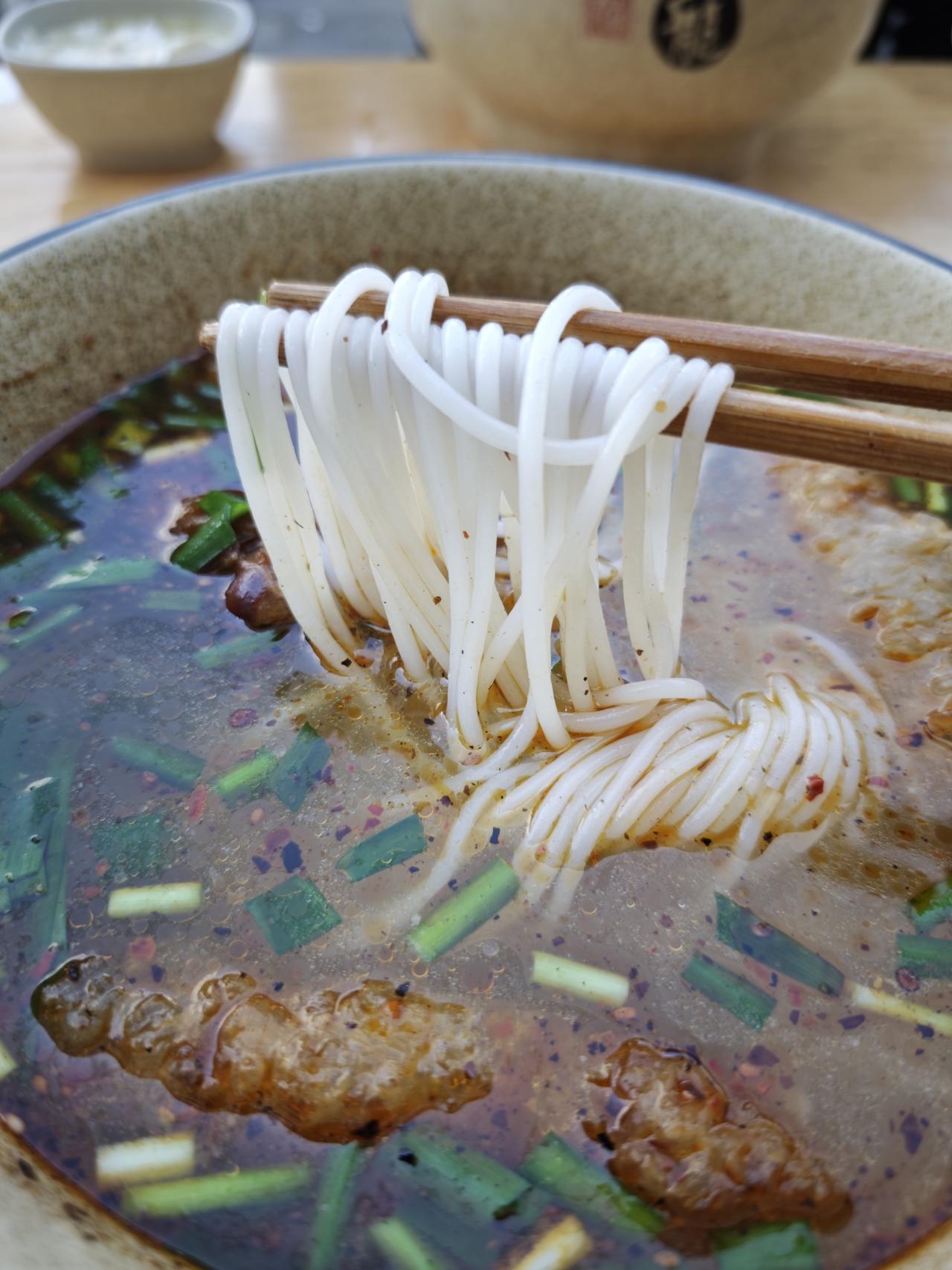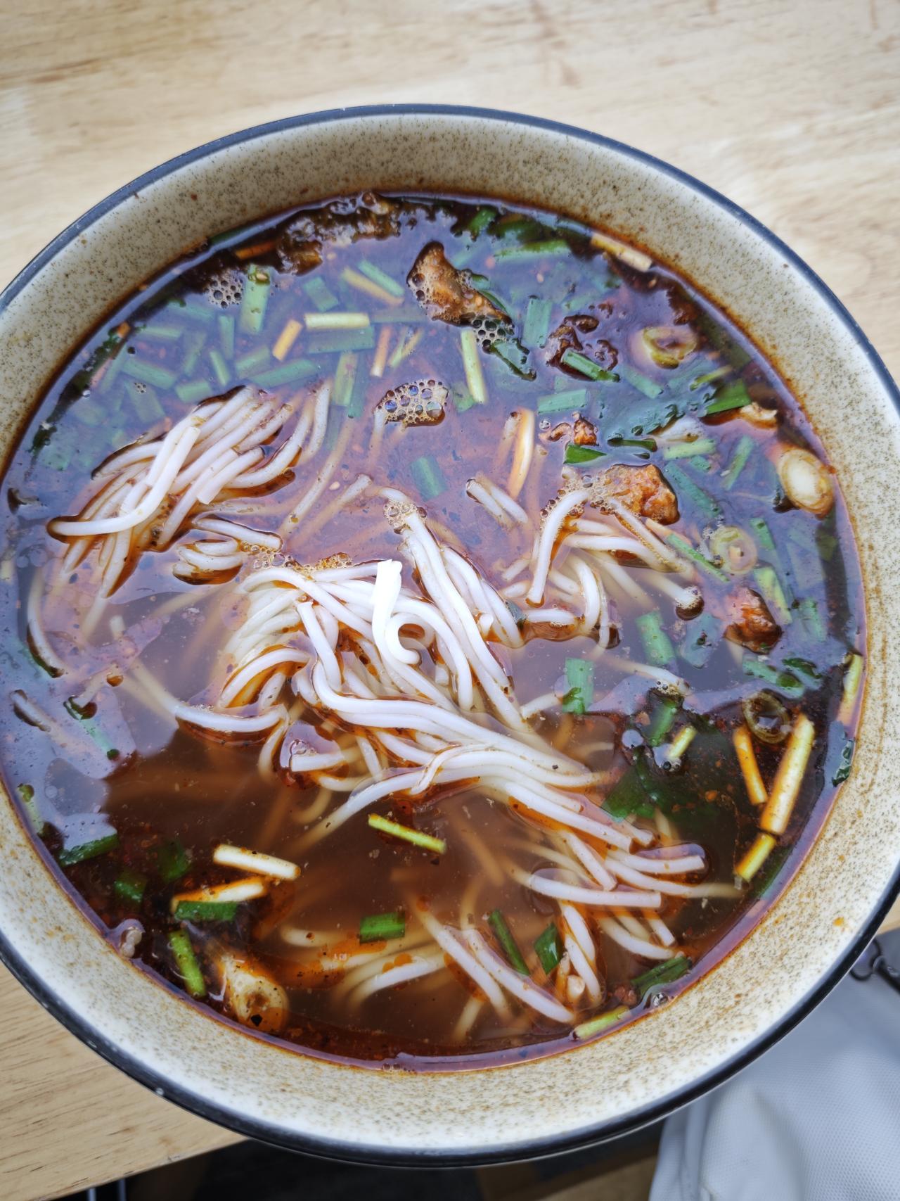 米線加了糊辣殼,淡淡的辣味兒讓我有點懷念起家鄉重慶的味道了。
