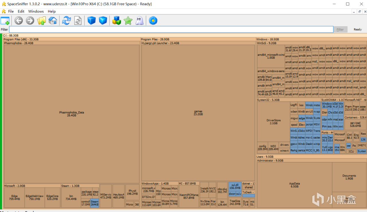 SpaceSniffer是磁盘占用分析工具,使用方法右键以管理员身份运行,然后选择C盘