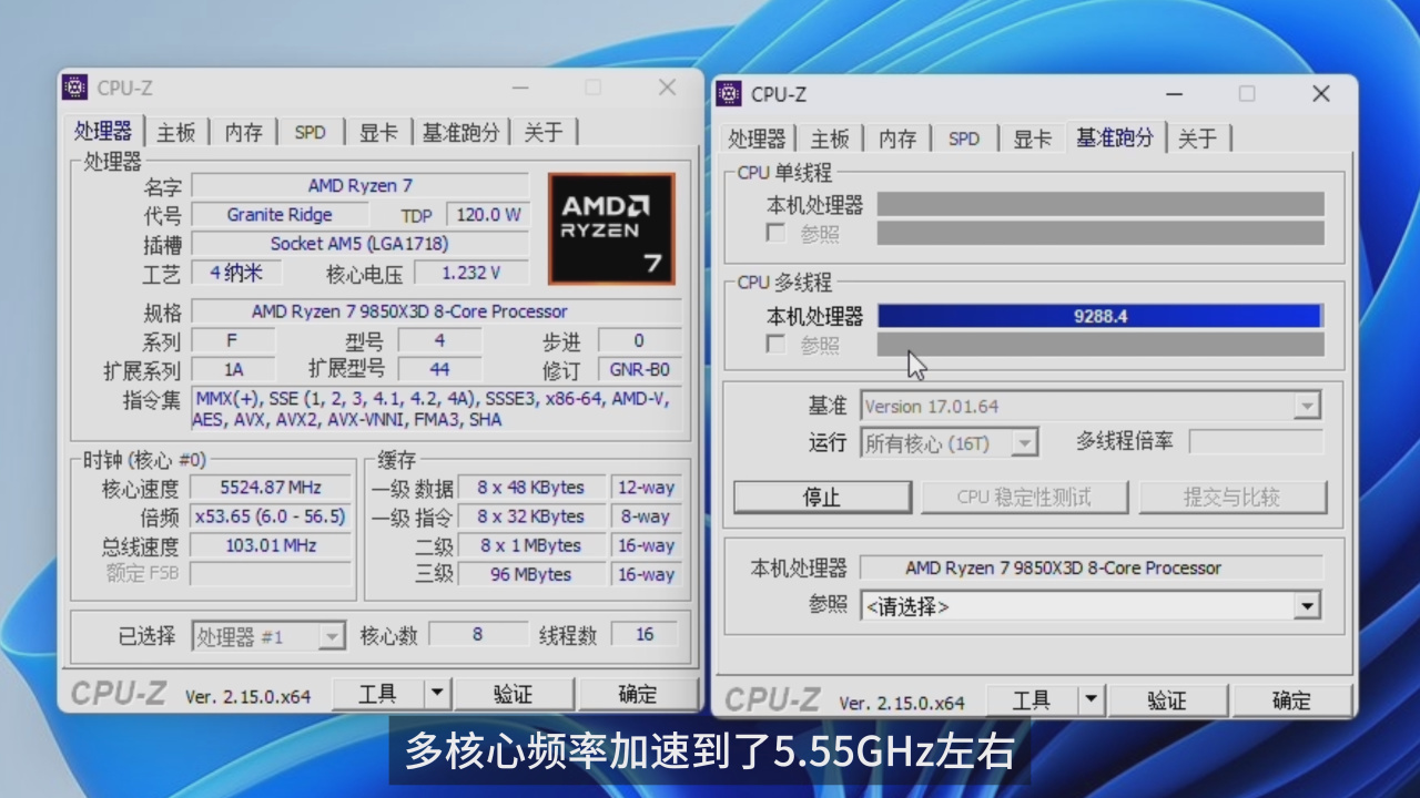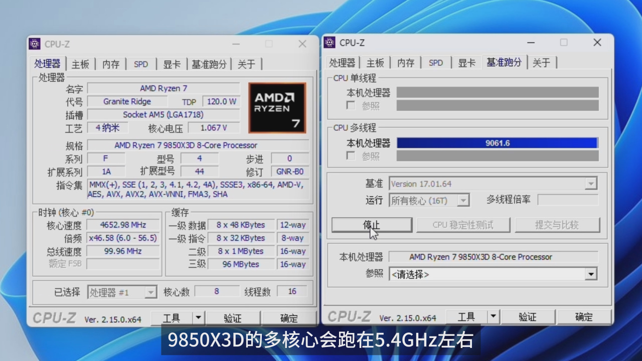 标准模式开启之后,9850X3D的多核心会跑在5.4GHz左右,单核心跑到5.6GHz左右;