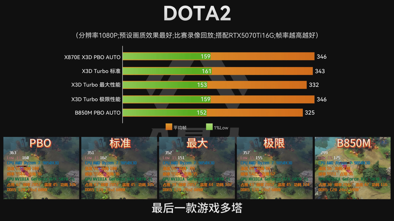 最后一款游戏刀塔,极限模式和PBO模式打平,都是346/159,B850 PBO模式则是325/152,平均帧上落后二十多帧。