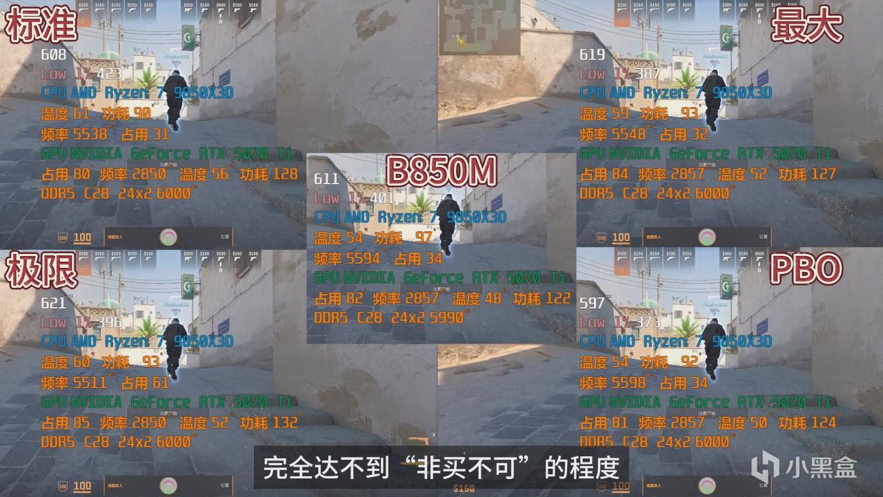 第四款游戏为CSGO,极限模式平均 594,1% Low366,PBO模式是 581/358,提升不算大,B850 PBO模式 581/355,和 X870E PBO几乎没差,平均帧完全一样,1% Low 只差3帧,游戏体感上基本一模一样。