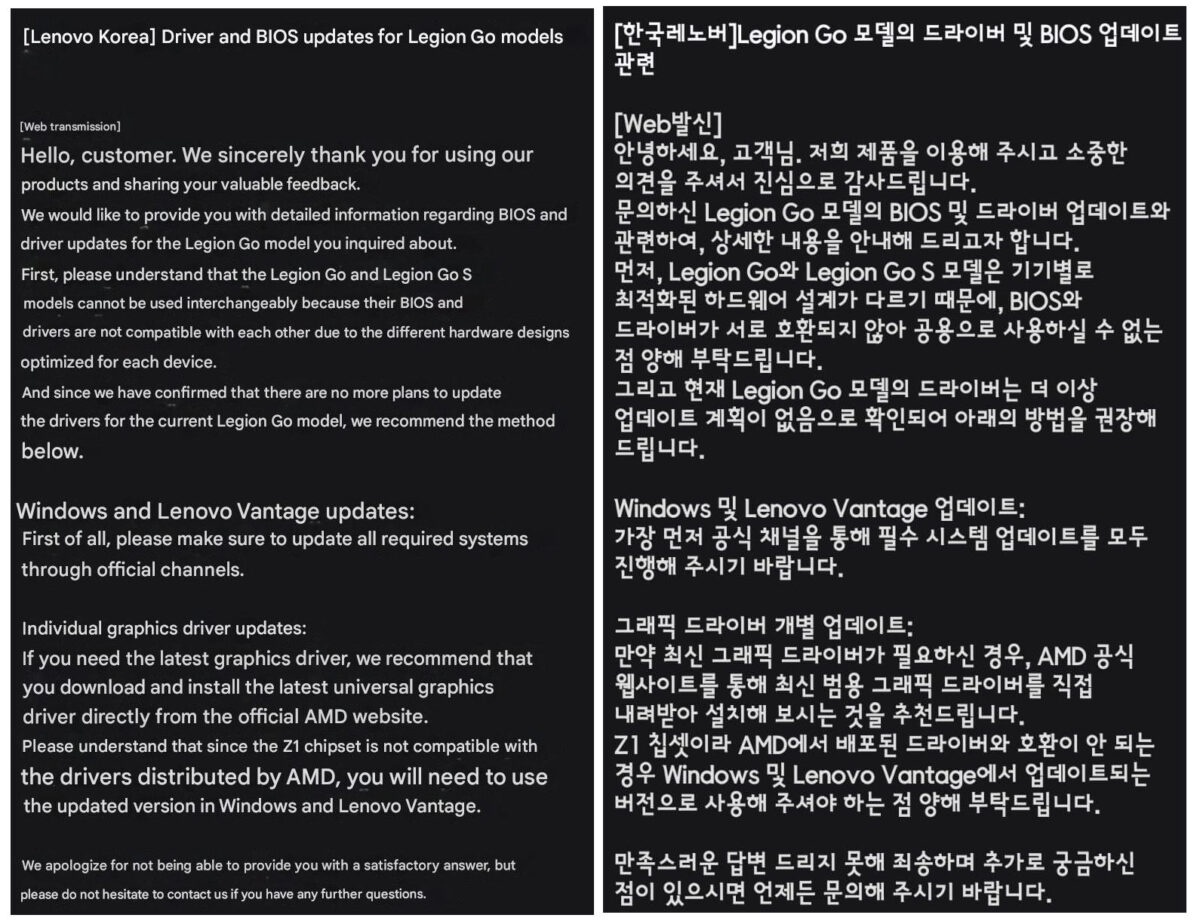 联想韩国在用户咨询的回复邮件中表示,Legion Go与后续机型Legion Go S硬件设计不同,二者驱动、BIOS完全不通用,且明确暂无Legion Go后续驱动更新计划