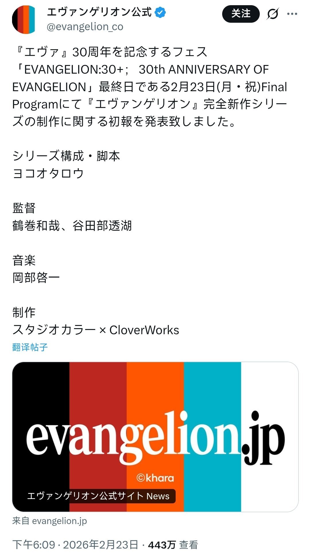 2月23日晚新福音战士官宣30周年剧场版动画新剧集,剧本由《尼尔:机械纪元》的监督横尾太郎负责撰写,音乐由冈部启一负责。
