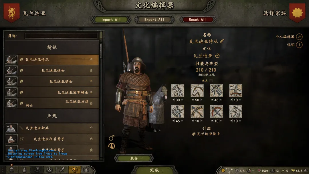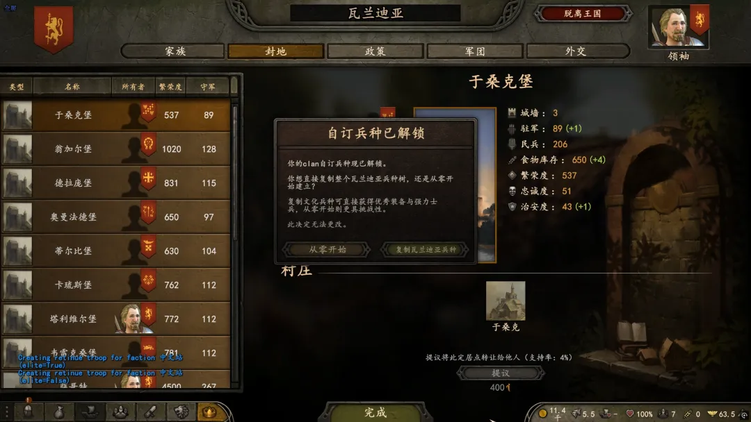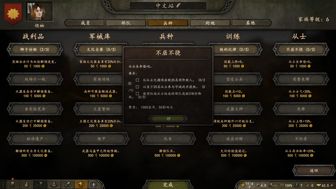 在获取自己封地后,即可招募自己的从士,(一套平民兵路线,一套贵族兵路线)从士可以使用自我模板,也可以套取王国兵种树模板。