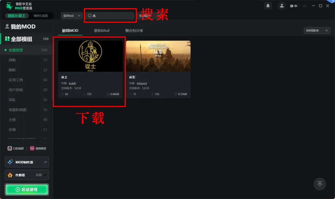 https://bbs.mountblade.com.cn/download_2208.html以及MOD四前置:https://bbs.mountblade.com.cn/download_45.html也可以直接百度搜索“骑砍中文站 下载中心”,进入下载站后搜索“从士”进行下载。