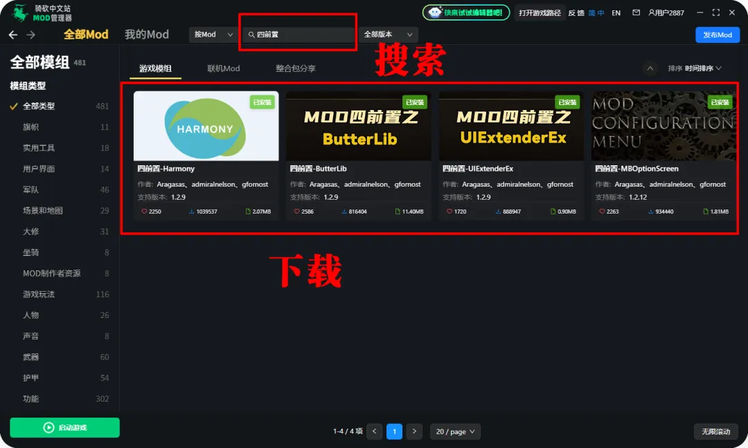 2、在右上角的搜索框中搜索“从士‘’和‘’MOD四前置”下载完成后在下载管理选项中进行安装
