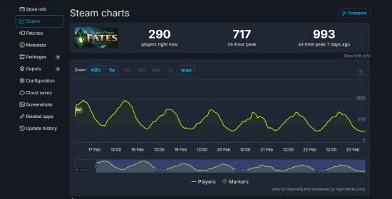 该作于2月16日正式上线,采用免费游玩(Free-to-Play)模式。然而据SteamDB数据显示,尽管背靠经典IP且无门槛限制,游戏的历史最高同时在线人数仅为993人,未能突破千人大关。