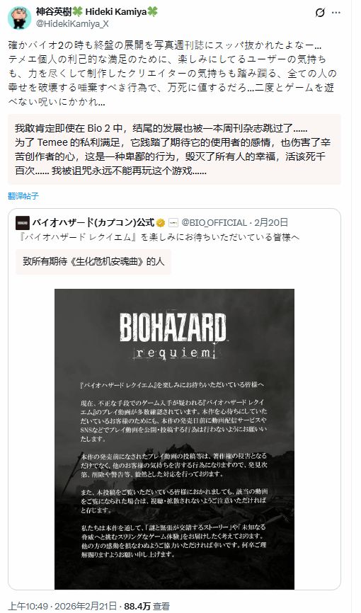 随着《生化危机:安魂曲》发售临近,网络上开始疯传有关本作剧情及结局的泄密内容。对此,曾执导原版《生化危机2》的传奇制作人神谷英树在社交平台 X 上火力全开,痛斥泄密者的行为“死不足惜”。