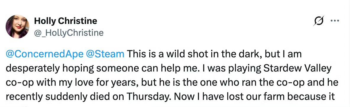 一位《星露谷物语》女玩家近日向游戏制作人ConcernedApe发出一封令人动容的求助信。她与爱人曾长期一起游玩多人模式,游戏存档一直由爱人打理,然而爱人突然离世,他们的农场也因此无法访问。