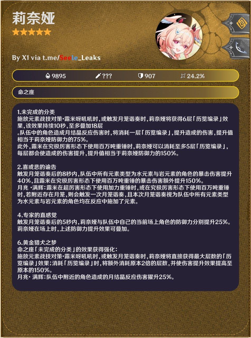 命之座「未完成的分类」的效果获得强化:施放元素战技对策·露米呀吼吼时,或触发月笼谐奏时,莉奈娅将直接获得最大层数的「历览编录J效果;消耗「历览编录」时,将额外消耗原本2倍的层数,并使伤害提升效果提高至原本的150%。