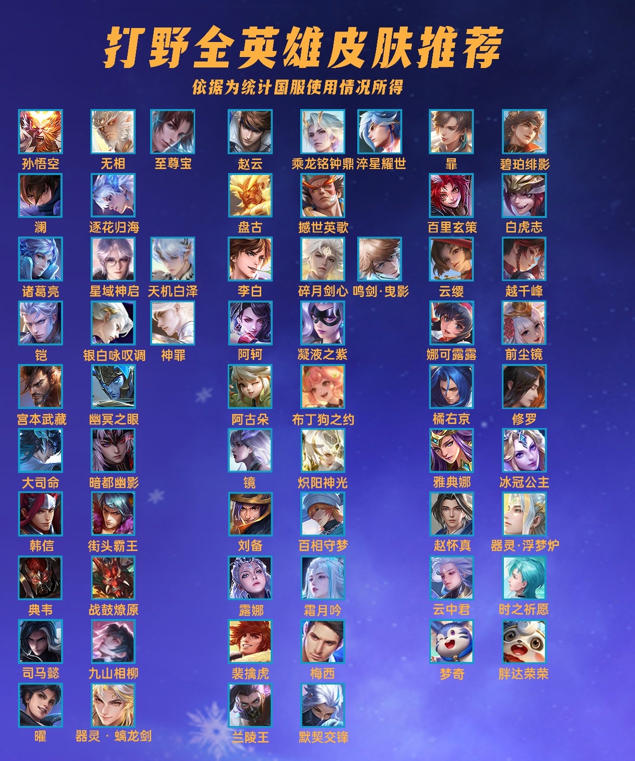 刘备这里很多人说的是时之恋人,也不算错,不过国服使用的都是这款皮肤的星元皮,之前推荐的百相守梦确实使用率比较低,看来还是要定期的更新国服使用数据,逐渐的摸索其中的逻辑,才能做出更好的皮肤推荐攻略。然后这是最新版本的打野位全英雄皮肤推荐,如果还对某一些英雄存在疑问,可以继续提出,我们继续优化,并且跟随以后的新皮肤进行更新。