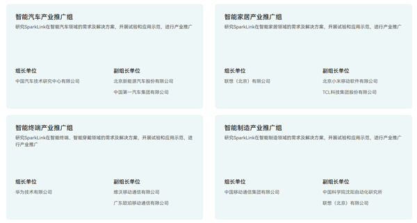 智能终端产业推广组由华为、vivo、OPPO组成,主要职责研究SparkLink在智能终端、智能穿戴领域的需求及解决方案,开展试验和应用示范,进行产业推广。