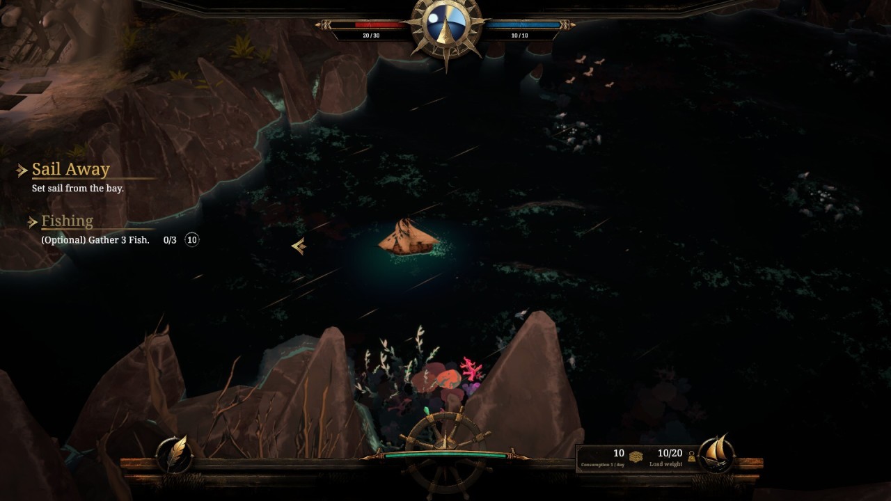故事驱动的卡牌游戏,刚打开的一瞬间幻视极乐迪斯科,新手提示,卡牌部分汉化不完全,探索部分,操控帆船收集资源,触发事件,战斗部分,调整船位规避伤害,打出手牌造成伤害,故事部分通过选项事件来影响玩家数值譬如傲慢,悲悯等,数值影响故事走向