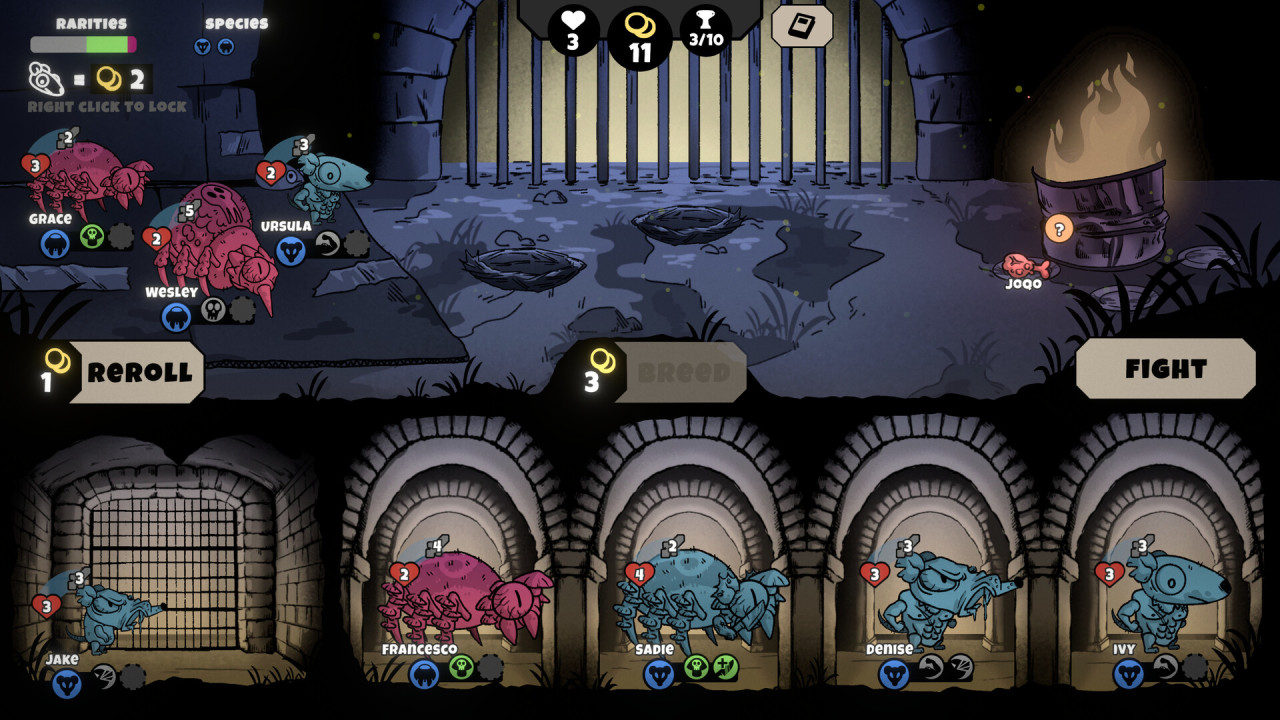 本来以为是对Super Auto Pets的拙劣模仿,实际上有不少新东西,去除了Super Auto Pets的饰品和3连升级,加上的是两种动物的杂交配队,后代随机获得父母词条,卖出动物获得的肉可以永久提高属性,demo体感良好