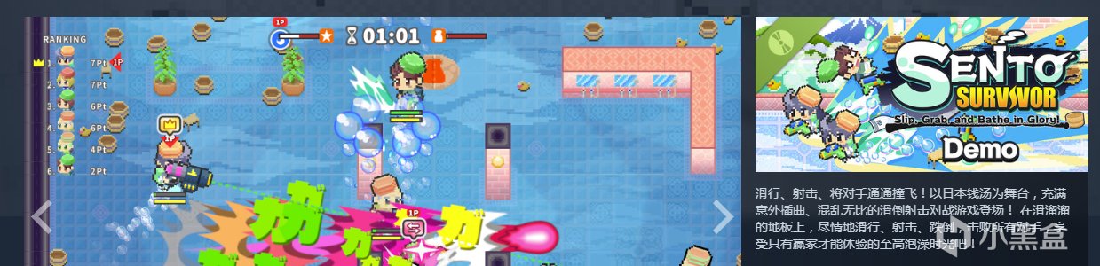 日本钱汤为主题的多人乱斗游戏,武器有滋水枪和狙击水枪两种,拾取道具获得加成,击败敌人获得分数,分数最多人的获胜,中规中矩的游戏