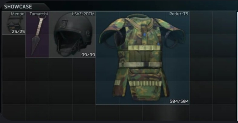 内容为:如图所示一个二级防弹武士面罩,一个苦无,一个四级自闭头,一套五级武士甲。