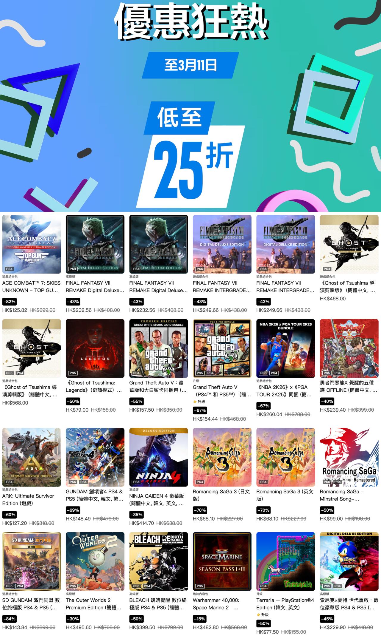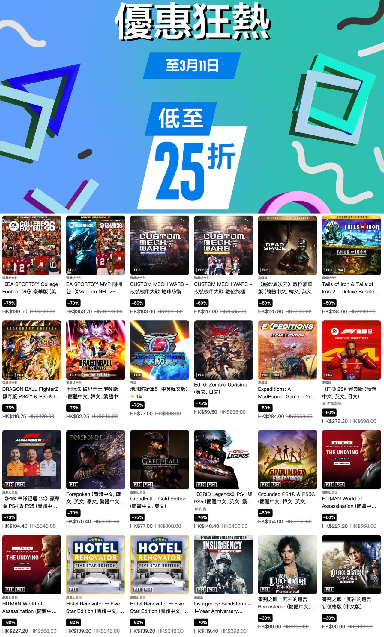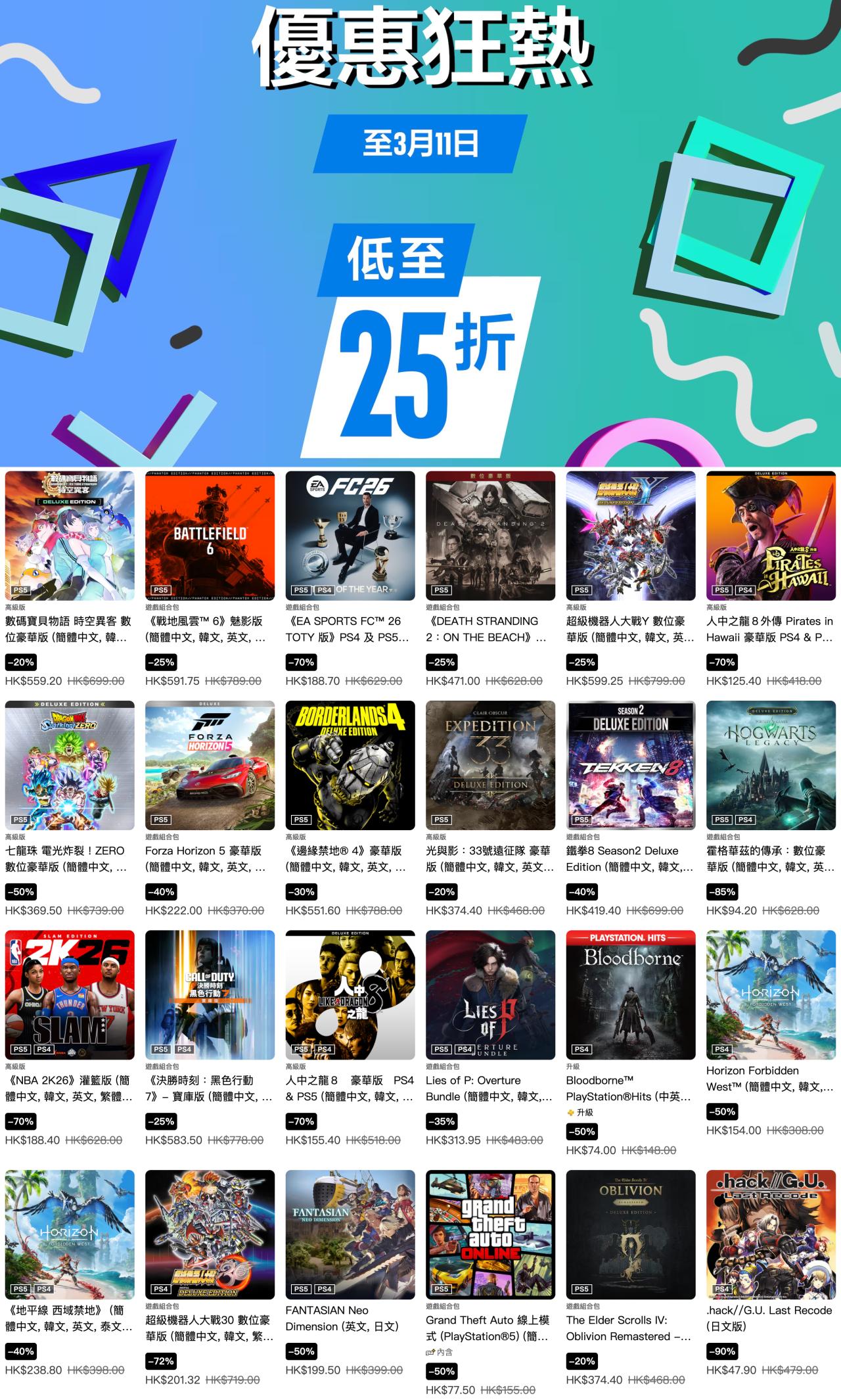 索尼PlayStation港服商店现已开启“优惠狂热”游戏折扣,《霍格沃茨之遗》豪华版、《光与影 33号远征队》豪华版、《地平线5》豪华版、《血源诅咒》标准版等多款游戏参与其中,本次游戏优惠活动截至3月11日,有需要的朋友可以关注下。
