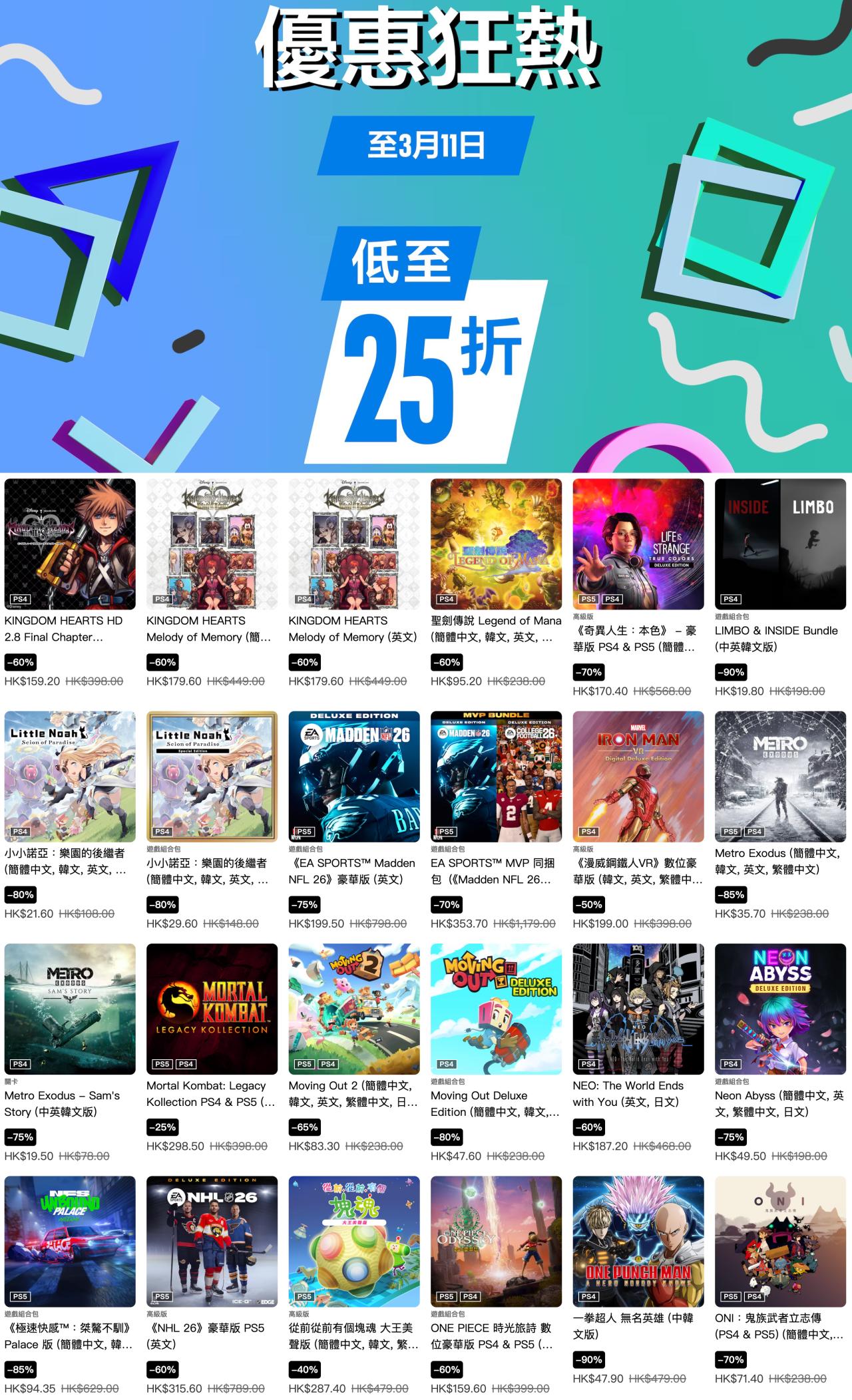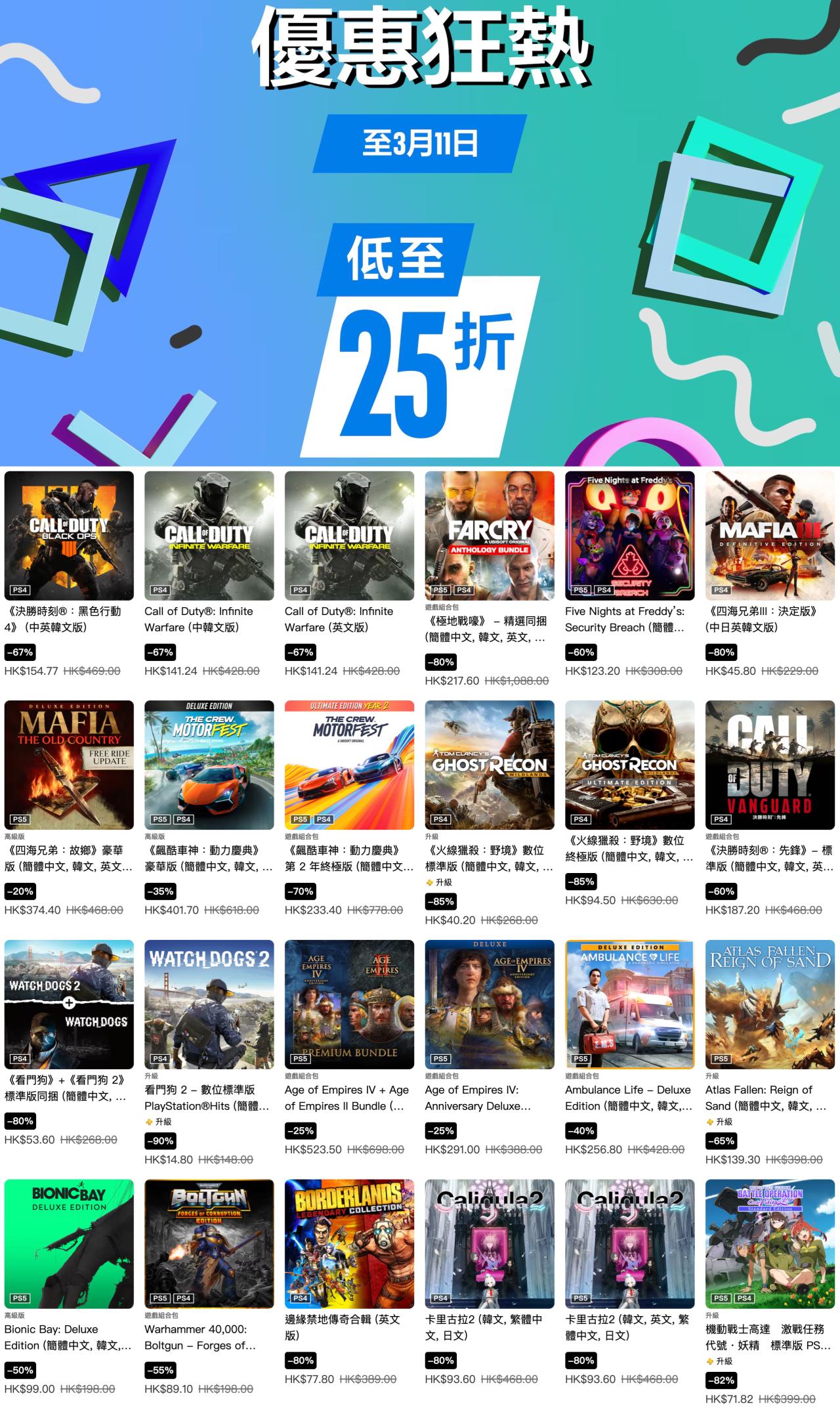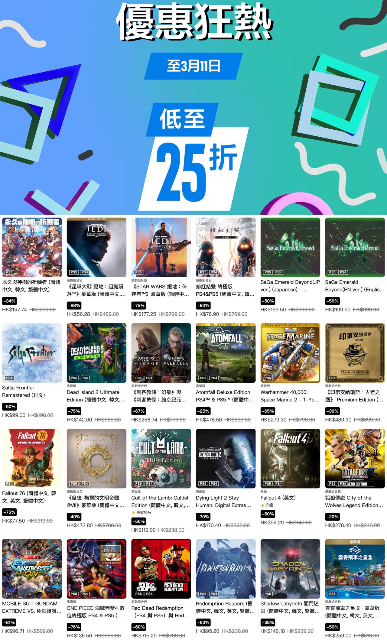 索尼PlayStation港服商店现已开启“优惠狂热”游戏折扣,《霍格沃茨之遗》豪华版、《光与影 33号远征队》豪华版、《地平线5》豪华版、《血源诅咒》标准版等多款游戏参与其中,本次游戏优惠活动截至3月11日,有需要的朋友可以关注下。