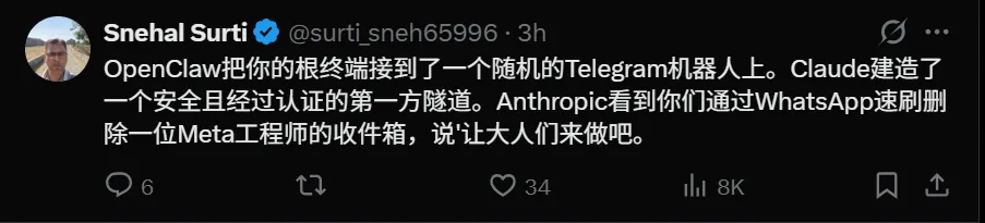 有人在推特上吐槽说这跟用 Txxxxxxm bot 控制终端的 OpenClaw 比起来,至少不会让人半夜惊醒担心服务器被黑。