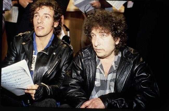 1985年录制现场的布鲁斯·斯普林斯汀和鲍勃·迪伦