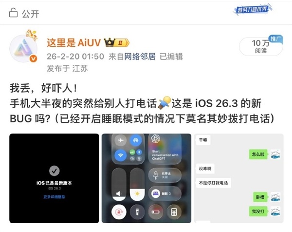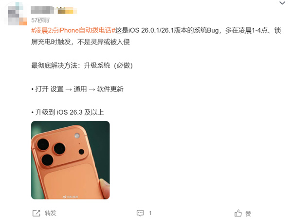 还有网友表示,这是 iOS 26.0.1/26.1 版本的系统 Bug,多在凌晨 1-4 点、锁屏充电时触发,不是灵异或被入侵。