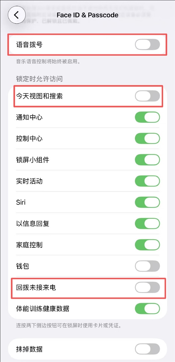 如果还是担心会误拨电话,可以顺便进到把面容ID与密码设置里,把语音拨号、今天视图和搜索、回拨未接来电这三个选项给关掉。