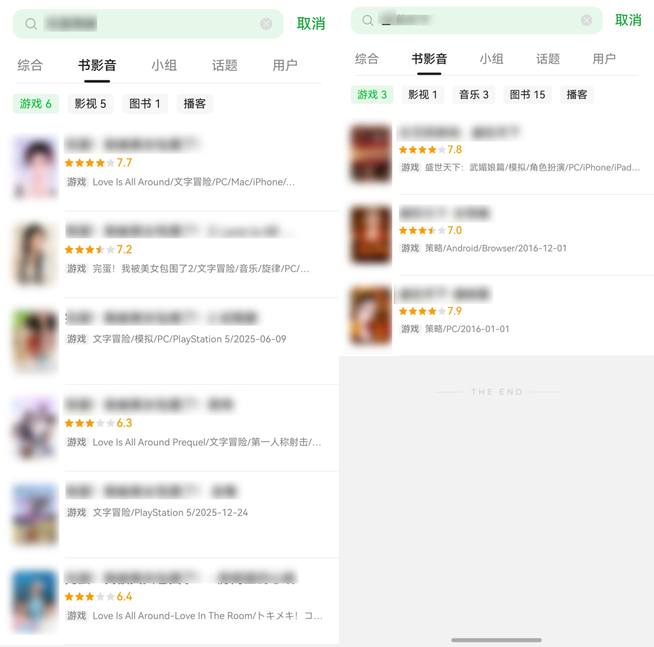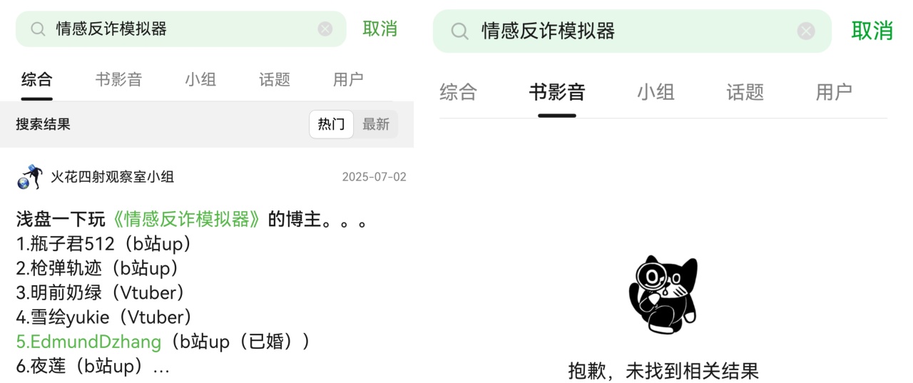 不論是書影音、話題、還是用戶,都顯示未找到相關結果。在綜合tab下,第一條內容也變成了一個【避雷玩過我們遊戲的up主】,從真人到虛擬主播無一倖免。。抱歉連累了他們,我們非常感恩!