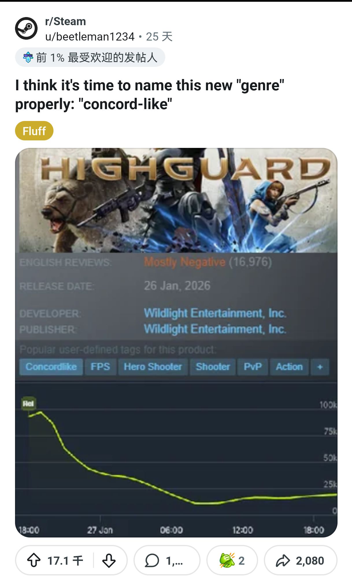 结果发售后仅两周,Steam在线人数暴跌98.5%(从10万跌至1600人),多半差评