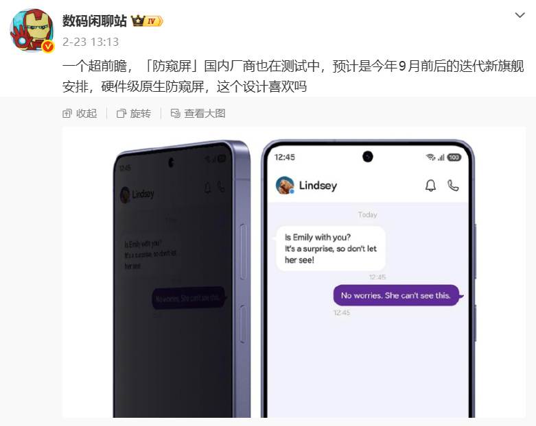 还可根据使用场景自动开启防窥模式,在浏览隐私内容开启,或者局部触发遮蔽敏感卡片或小窗。