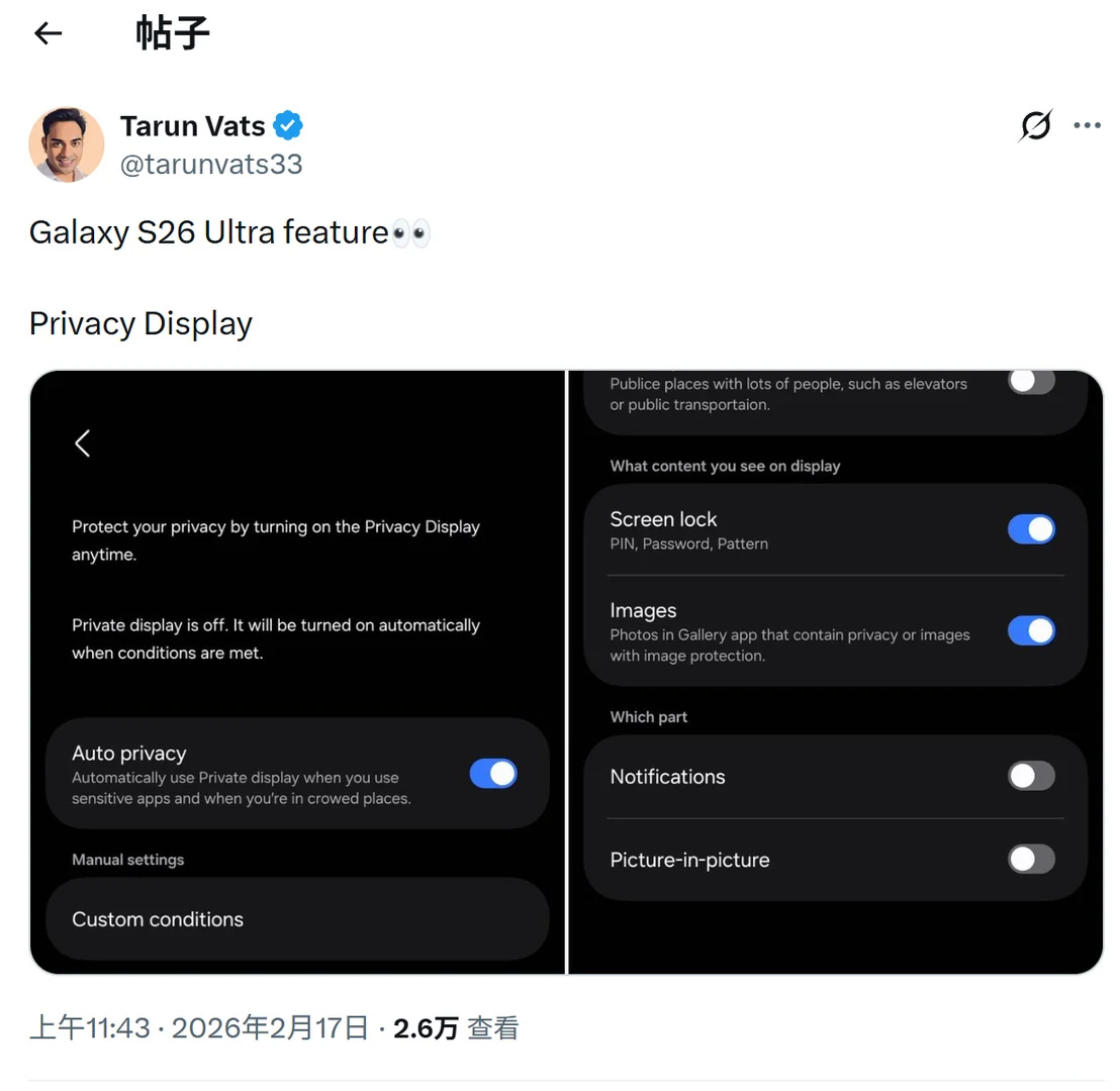 三星 Galaxy S26 Ultra 将于23日凌晨2:00发布搭载“防窥屏”(Privacy Display)