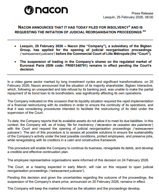 游戏发行商Nacon已正式提交破产保护申请。根据公告文件,申请原因主要源于其控股股东Bigben Interactive未能向债券持有人支付部分债券偿还,这起自Bigben合作银行团"意外且迟来的拒绝",也对Nacon自身运营造成重大冲击。