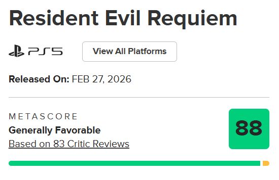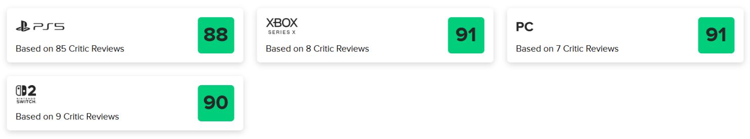 由卡普空开发的生存恐怖游戏《生化危机9:安魂曲》全球媒体评分正式公布。根据Metacritic数据显示,本作PC版目前获得91分(基于7家媒体评测)、PS5版目前获得88分(基于85家媒体评测)、Xbox版91分(基于8家媒体评测)、Switch2版90分(基于9家媒体评测)。