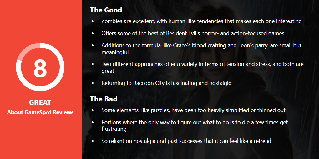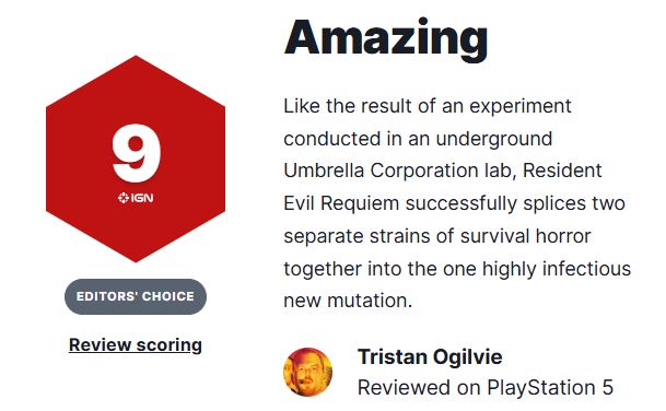 《生化危机:安魂曲》为这个在过去十年间持续保持高水准的系列树立了新的标杆。通过融合经典生存恐怖元素与《生化危机4》中更侧重动作的玩法,本作呈现了节奏精准的完美体验。加之富含深度的剧情设定与大量的隐藏彩蛋,或许这正代表着《生化危机》系列的终极形态。
