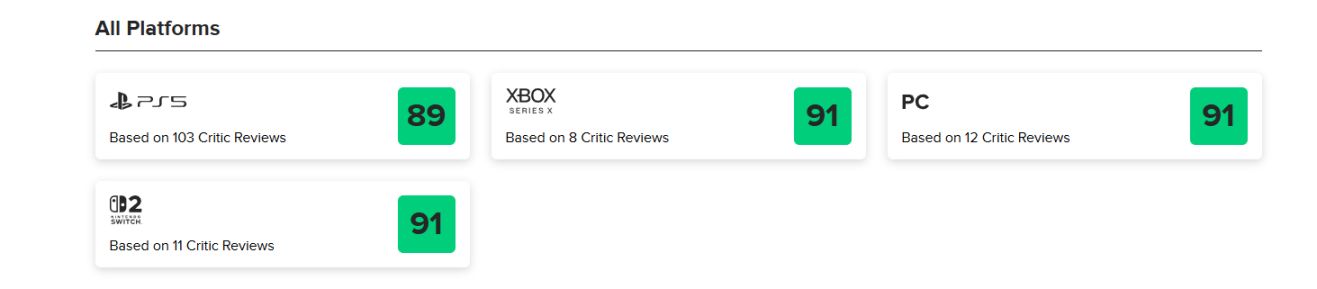 截至發稿前,Metacritic 收錄 103 家媒體(PS5),均分 89 分。其中 98 個好評,2箇中評,0個差評。