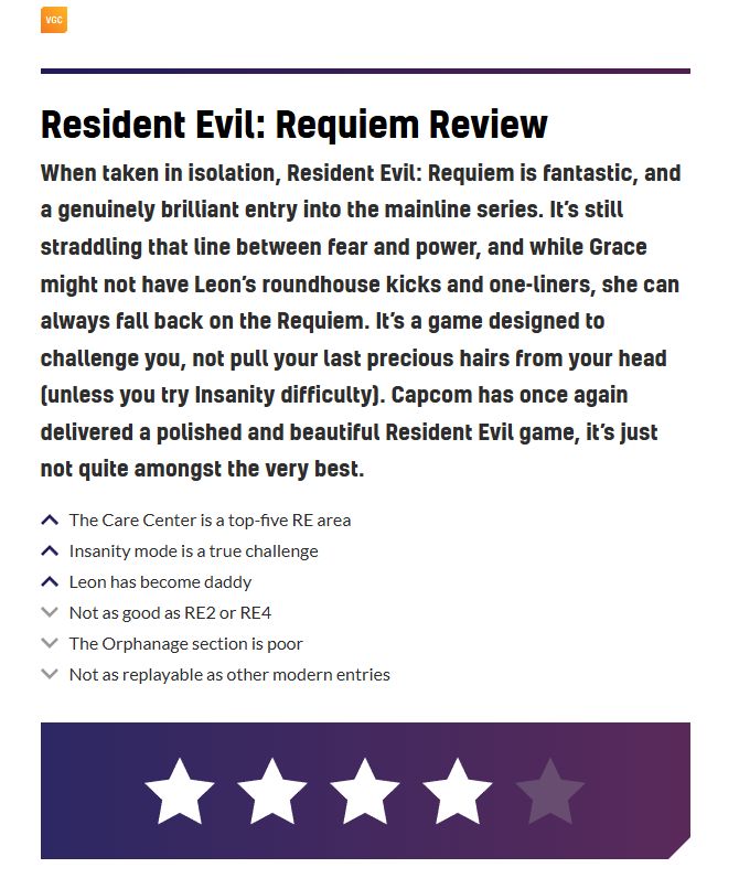 當單獨來看時,《生化危機:安魂曲》是一部傑作,也是主線系列中一個真正出色的新成員。它依然在恐懼與力量感之間走着鋼絲,雖然格蕾絲可能沒有里昂的迴旋踢和俏皮話,但她總可以依賴“安魂曲”。這款遊戲旨在挑戰你,而非揪掉你最後所剩無幾的珍貴頭髮(除非你嘗試“瘋狂”難度)。卡普空再次呈現了一部精雕細琢、畫面精美的《生化危機》遊戲,只是它尚未能躋身最頂尖的那一列。